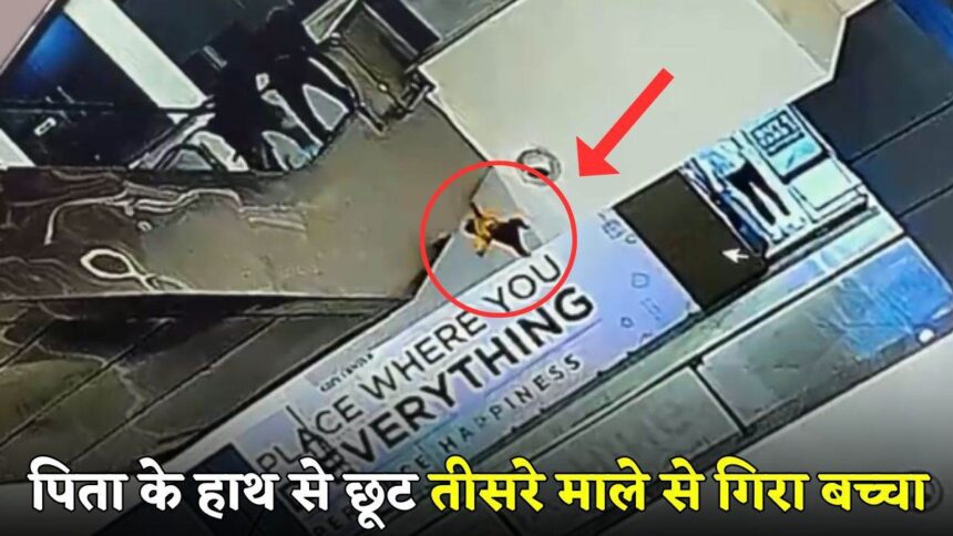रायपुर के एक मॉल में एस्किलेटर में चढ़ते समय एक बच्चा फिसल जाता है। दूसरे बच्चे को पकड़ने के चक्कर में परिजन के हाथ से मासूम छिटक गया और लगभग 40 फीट नीचे जा गिरा