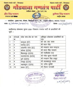 रायपुर। छत्तीसगढ़ में लोकसभा चुनाव 2024 के रण में कांग्रेस, बीजेपी और बसपा के बाद अब गोंडवाना गणतंत्र पार्टी ने दांव खेल दिया है. गोगपा ने अपने प्रत्याशियों के नाम का ऐलान किया है. गोंडवाना गणतंत्र पार्टी 10 लोकसभा सीटों से अपने प्रत्याशियों को मैदान में उतारा है. जिसमें सरगुजा (ST) से डॉ. एल. एस. उदय, रायगढ़ (ST) से मदन गोंड़, जांजगीर चांपा (SC) से मनहरण लाल भारद्वाज, कोरबा (GEN) से श्याम सिंह मरकाम, बिलासपुर (GEN) से नंदकिशोर राज, राजनांदगांव (GEN) से नरेश कुमार मोटघरे, दुर्ग (GEN) से मनहरण सिंह ठाकुर, रायपुर (GEN) से लालबहादुर यादव, महासमुन्द (GEN) से फरीद कुरैशी और बस्तर (ST.) से टीकम नागवंशी को प्रत्याशी बनाया गया है.