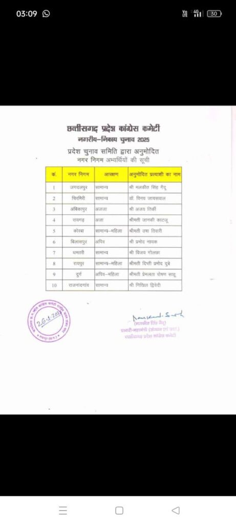 लंबे इंतज़ार के बाद आखिरकार कांग्रेस ने नगरीय निकाय चुनाव के लिए प्रदेश चुनाव समिति द्वारा अनुमोदित सूची जारी कर दी है, जिसमें रायगढ़ से महापौर प्रत्याशी के लिए पूर्व महापौर जानकी काटजू का ही नाम तय किया गया है, कांग्रेस ने 10 नगर निगमों के महापौर प्रत्याशियों के साथ ही, अध्यक्षों की सूची जारी की है जिसमें रायगढ़ से जानकी काटजू को दोबारा मौका दिया गया हैं
