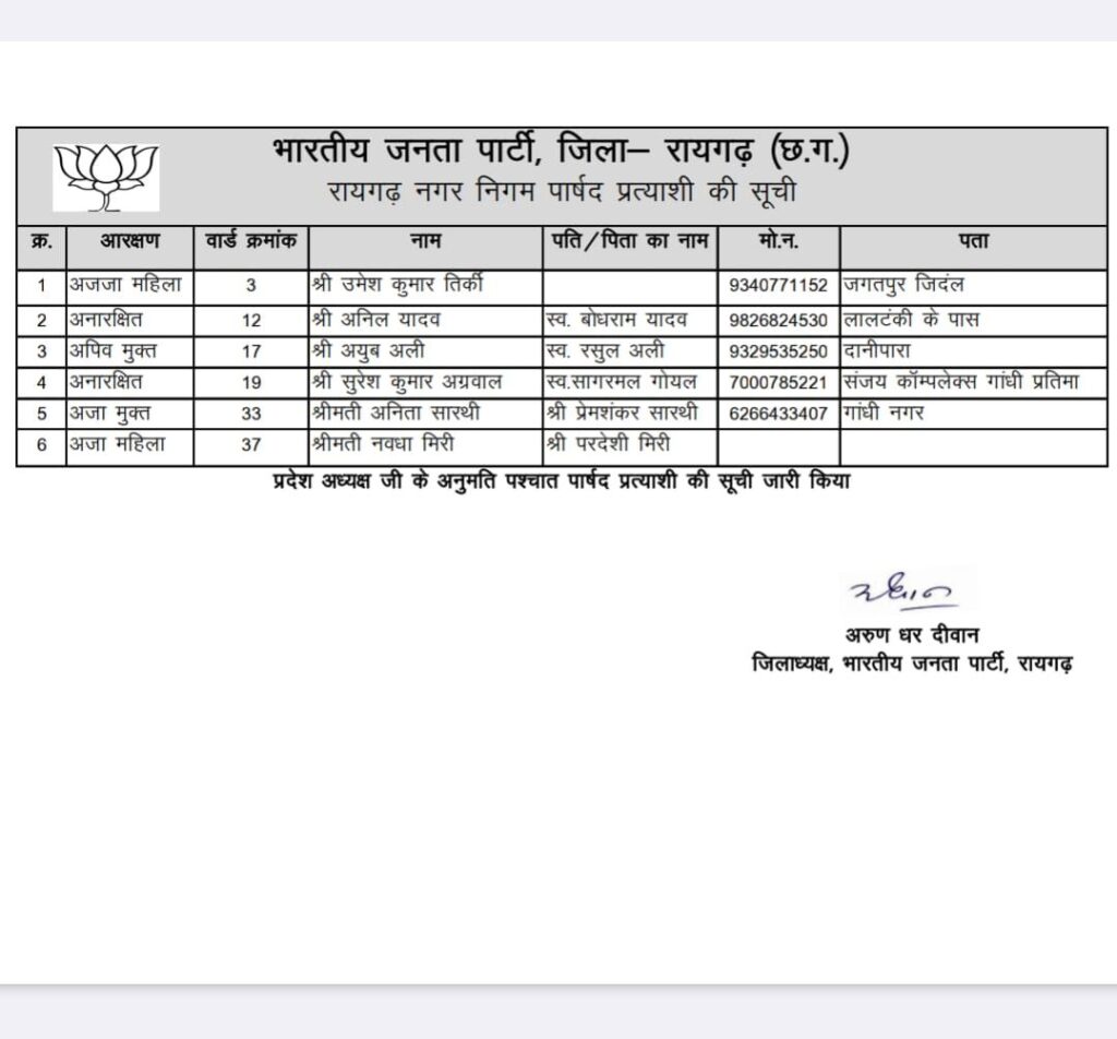 बीते दिनों भारतीय जनता पार्टी ने 42 नामों की सूची जारी कर दी थी, और सबसे हाई प्रोफाइल 6 वार्डों के पार्षद प्रत्याशियों के नाम पर संशय के बादल घिरे हुए थे, लेकिन भाजपा ने आज सूची जारी कर दी जिसमें सबसे चर्चित 19 नंबर वार्ड के लिए पूर्व सभापति सुरेश गोयल के नाम पर मुहर लग गई है,वहीं जयंत ठेठवार के सुरक्षित गढ़ माने जाने वाले वार्ड नंबर 12 से अनिल यादव गुरुजी को टिकट दी गई है, वार्ड नंबर 17 से सलीम के गढ़ को भेदने के लिए भाजपा ने अयूब अली को टिकट दी है इसी तरह वार्ड नंबर 3,33, और 37 के लिए प्रत्याशी घोषित कर दिए गए हैं